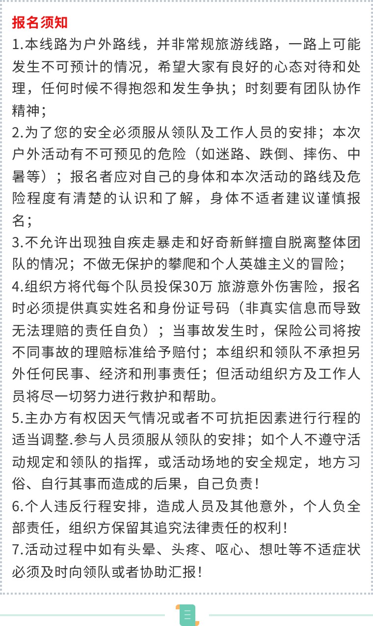 注:本活动为户外运动路线,具体行程可能会根据实际情况稍作调整,但原则一定是让小伙伴们安全、省钱、尽兴。希望团友给予理解和配合,谢谢。