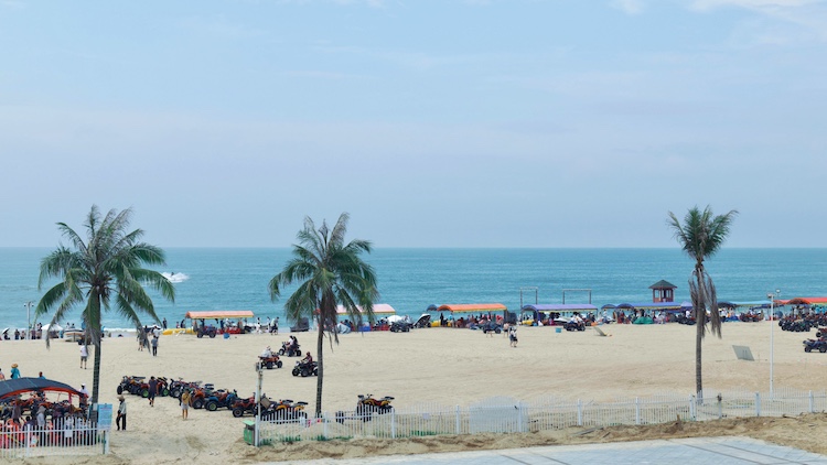 这里沙滩呈东西走向,绵延约2.5公里,沙质细腻,游玩项目多,非常适合在这玩耍。