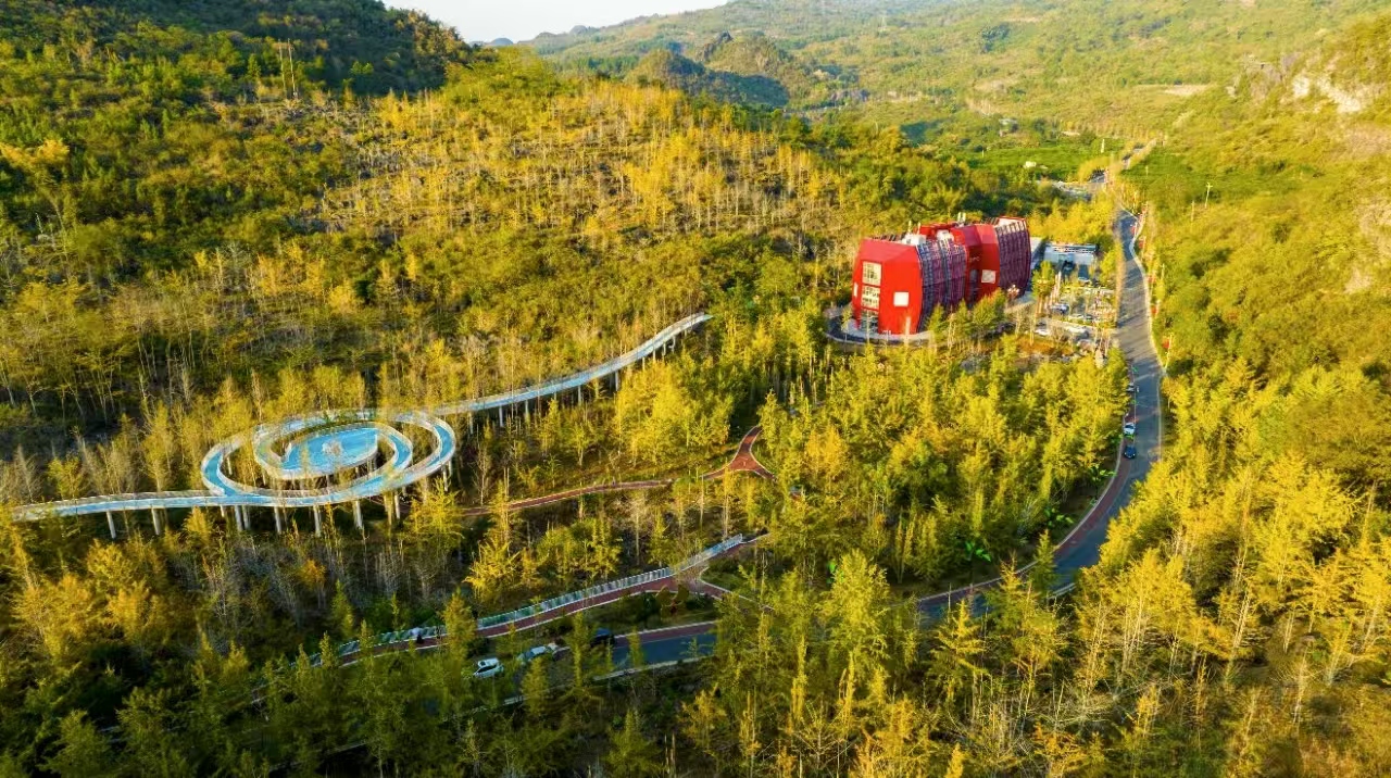 蓝色的银杏栈道像小河般流淌在银杏林,