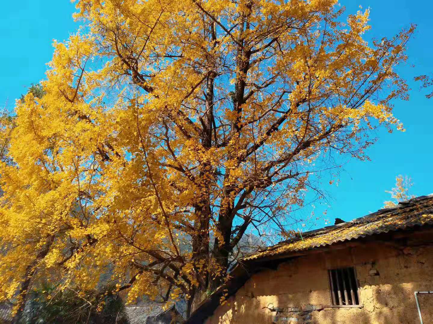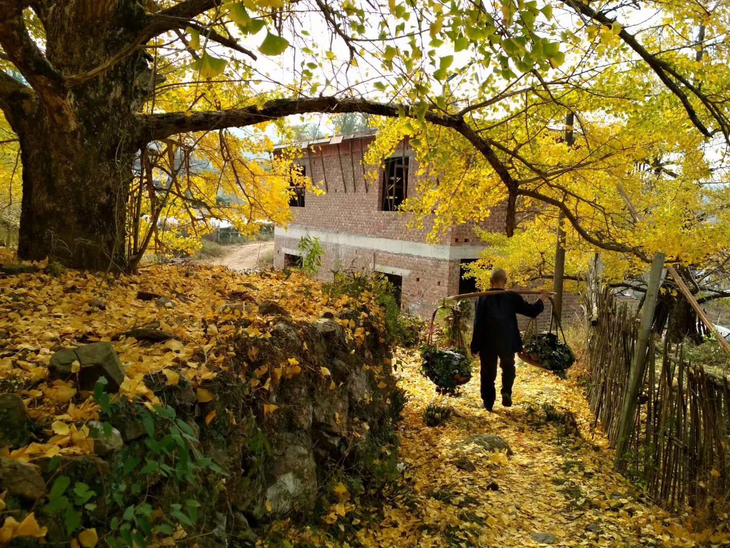 11:00到达秦家大院,可爬上楼顶或者山坡俯瞰整个村庄,可去田间摘罗汉果,可漫步这一片土砖土瓦的巷子发呆,细细品味这古韵;村口有几棵千年银杏,一阵风吹来秋叶随风飘落的诗意。。。也可以翻越一个山坡,山上松树林,枫叶林,银杏林遍布,在深秋时,这里由如是一幅油画~