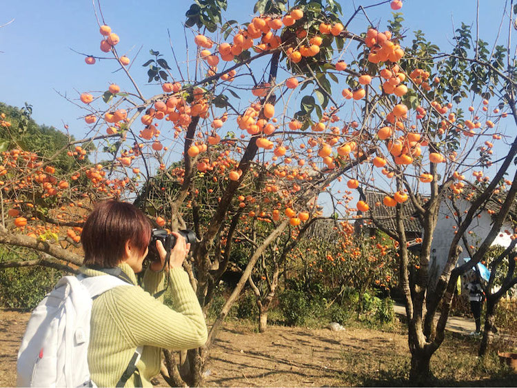 这里家家户户种柿子,村中几十座漂亮、精致的别墅掩映在苍翠的柿子林丛中,远远近近的大小山峰衬托,真是绝妙的山水国画。
