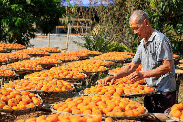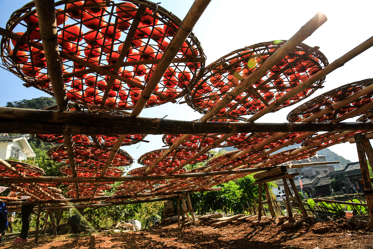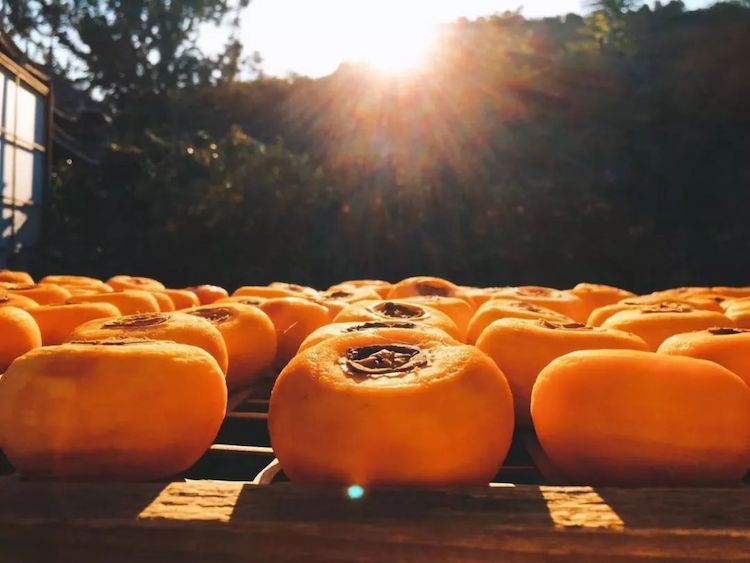 柿子丰收时,当地农民趁着晴好天气收柿子、晒柿子,每家门前院里晒满了柿子,房前屋后遍地金黄,好一副晒秋画卷。