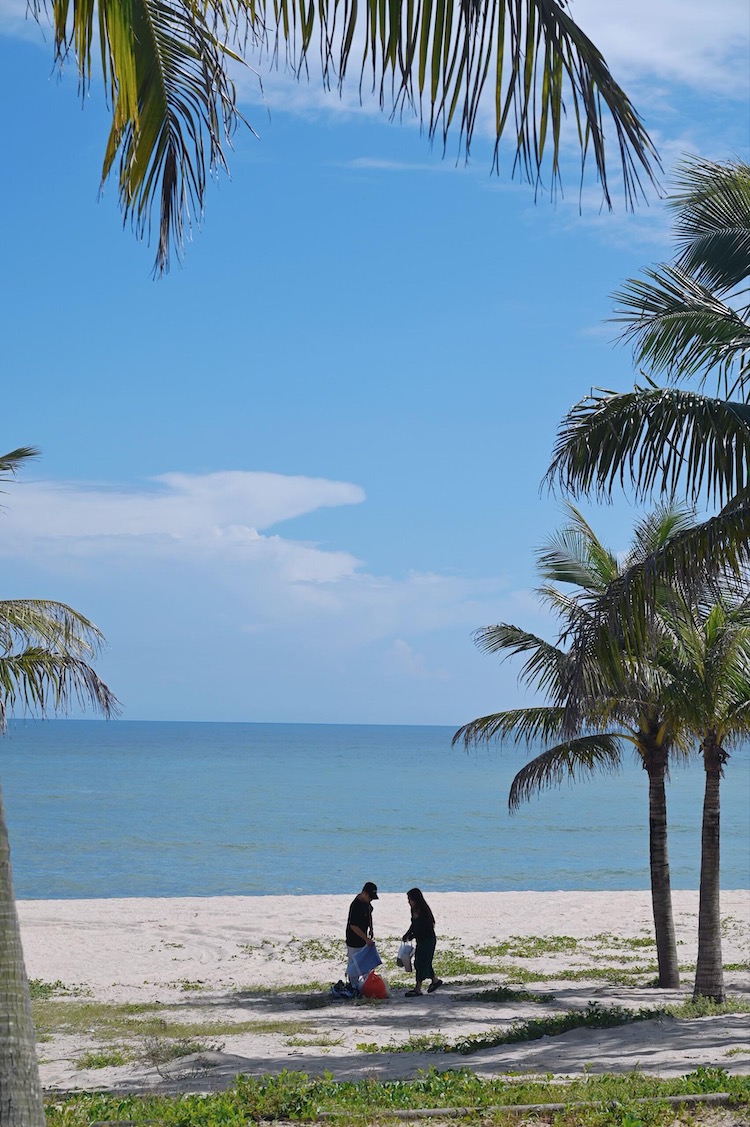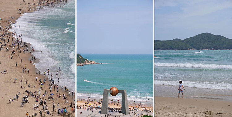 从高处俯瞰,青澳湾犹如一轮弯弯的新月。金黄柔软的沙湾绵延2400米,一直延伸到水下几百米之外。