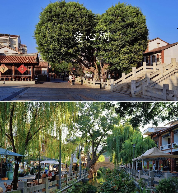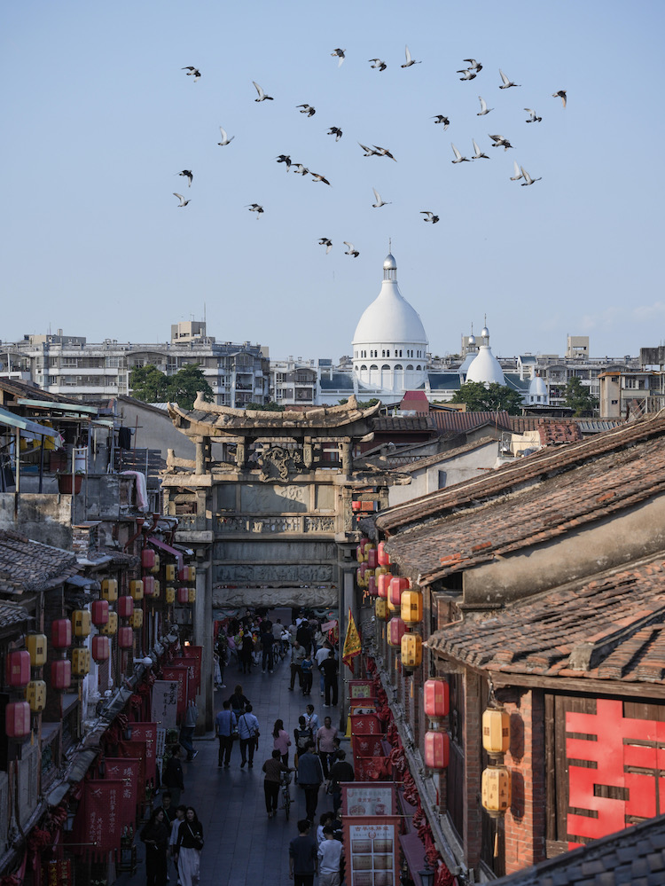 避风坞、船坞、锚地、岸线等渔港遗迹得以保留,岸边骑楼与远处世茂双子塔形成新旧对比。