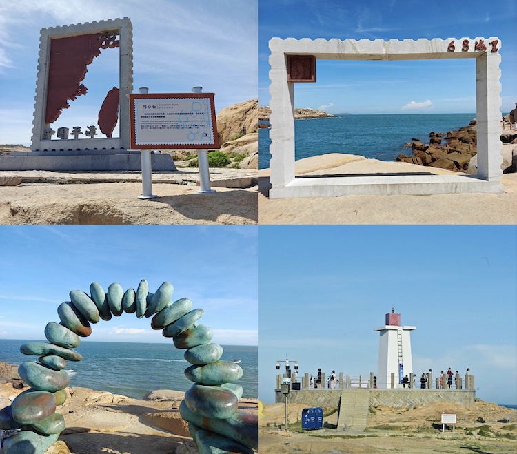 景区以海蚀地貌为载体,设计了多处寓意两岸亲情的主题景观:墨水石柱用紫铜铸造,形似水滴般的墨点滴落,寓意家书传情;两岸同心窗是一枚花岗岩围砌的巨大邮票,令人联想起余光中《乡愁》的诗句;望归石形似海龟凝视海峡对岸,守护着归来的期盼;两岸同心石以邮票与地图为元素,串联起海峡两岸。