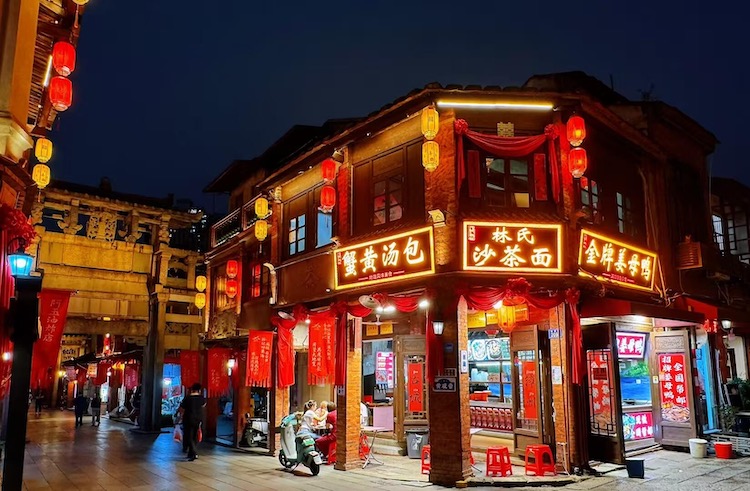 晚上可在西街附近餐厅品尝泉州面线糊、牛肉羹、姜母鸭等特色美食。
