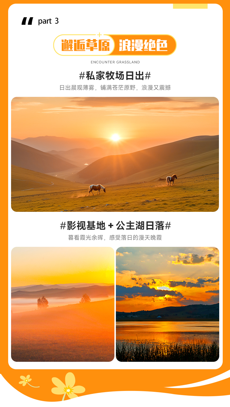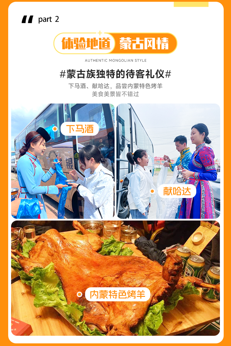 想看日出的小伙伴可以早起自行选择【将军泡子日出】/【马踏水花】;在【将军泡子】观看草原日出,静待晨曦,也可开启【马踏水花】的晨曦拍摄。天空霞光万道,群马在蒙族驭手的指挥下,像离弦的剑向湖对岸奔去,踏起的水花如一堆堆碎白玉,壮怀激烈的场面仿佛把人瞬间穿越到300多年前康熙御驾亲征,在此地与蒙古叛军葛尔丹决一死战的激烈情境。
