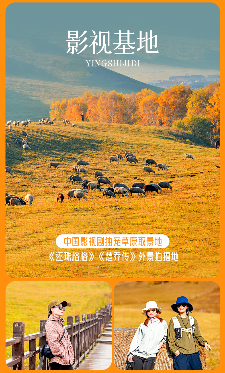 随后,吃完午饭短暂休息后开始我们的徒步之旅,我们坐车前往【徒步起点】,沿着原生态草原一路走到【欧式草原】【影视基地】 (徒步全程8KM),在这里开启今日徒步之旅。蓝天、白云、青山、白桦林衬托着喧闹的百花世界,勾勒出一幅幅绚丽多姿的欧式油画。其中,《还珠格格》《康熙王朝》《射雕英雄传》《芈月传》《狼图腾》等著名影视剧都曾在此取景。我们打卡拍照完沿着栈道上去看日落,夕阳的余晖染红了天边,漫天的云彩在落日的照耀下熠熠生辉,如同一幅瑰丽的画卷。