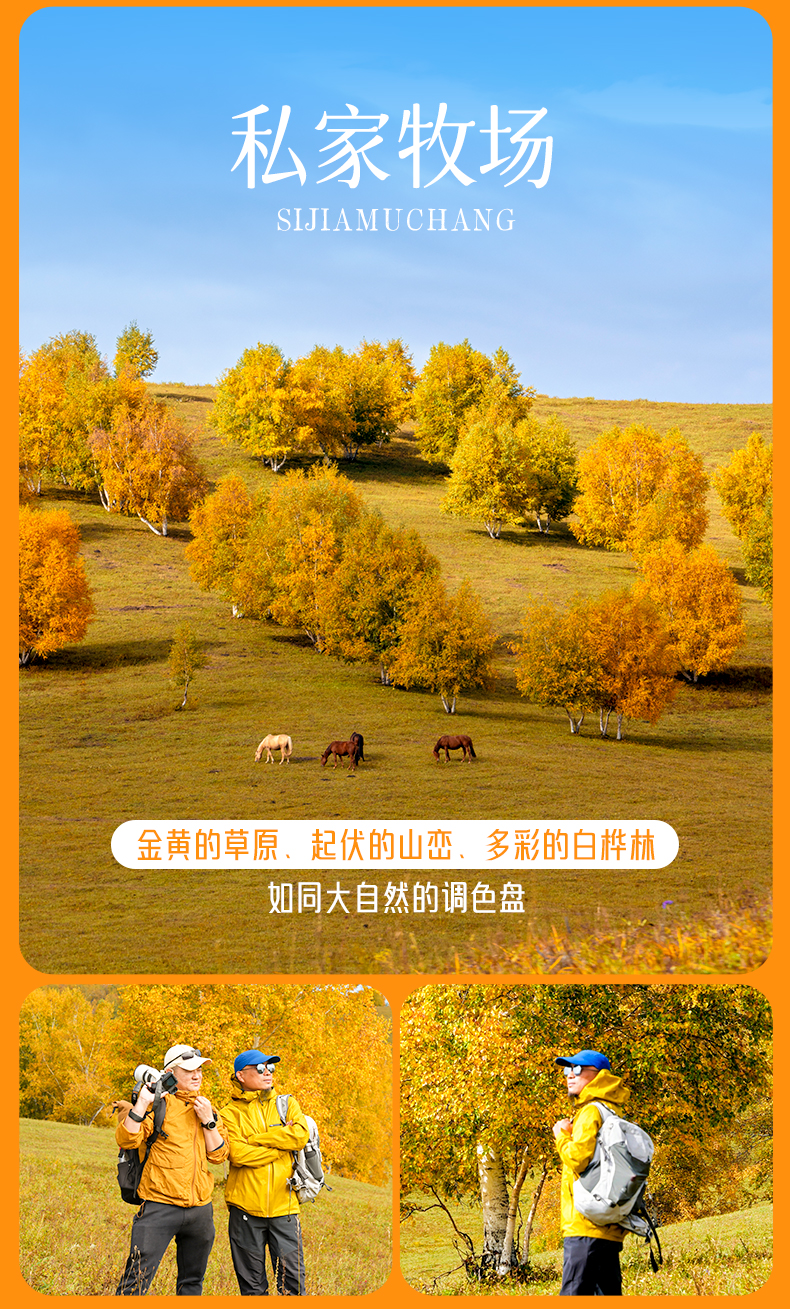 早餐后我们前往【私家牧场】(徒步全程10KM)。深入草原秘境,白桦疏林、成群牛羊交相辉映,一路风光无限。深入草原,白疏林、偶遇成群牛羊交相辉映,一路风光无限。在风景美的地方,我们可以拍照,游玩、尽情的奔跑。漫步在私家牧场,望云卷云舒,一马平川,沃野千里,在广阔的天地间追寻自由的脚步~大家可以在徒步途中或者结束后自行午餐【根据自身情况安排即可路餐需自备】