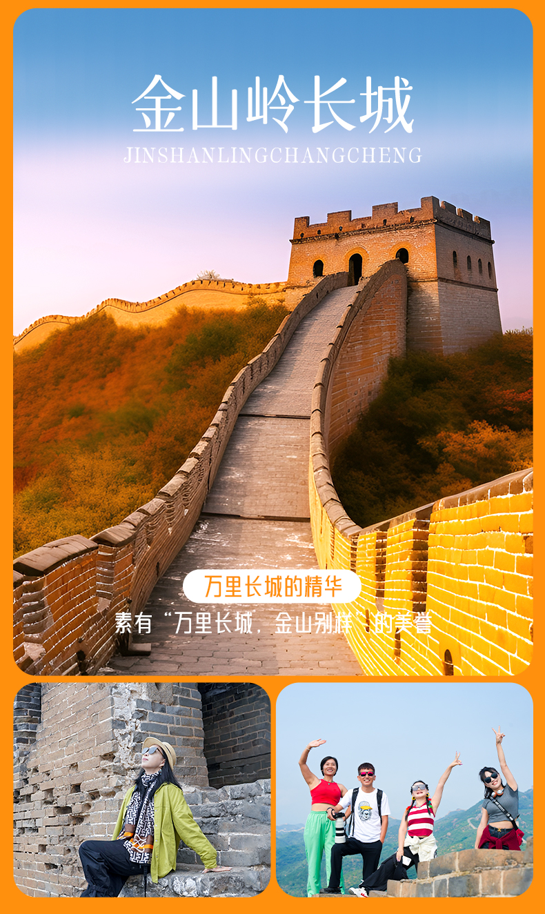 早餐后,乘车前往素有“万里长城,金山独秀”之称的【金山岭长城】(徒步全程6KM),金山岭长城始建于明洪武元年,西望古北口,东连司马台,此时的金山岭长城内外百花争艳,云海飘渺浩瀚,更添气势。【注意:在金山岭长城不想徒步的话,也可以选择(休闲游)自行游览】
