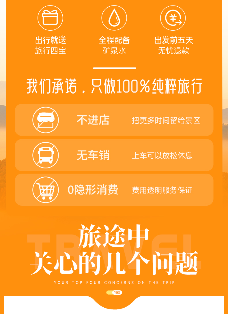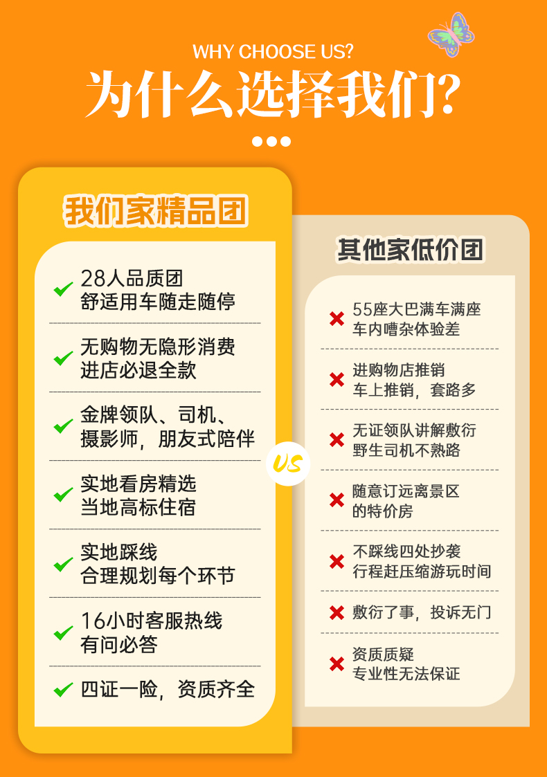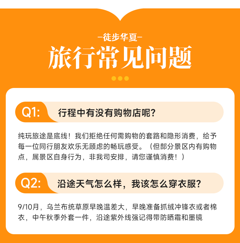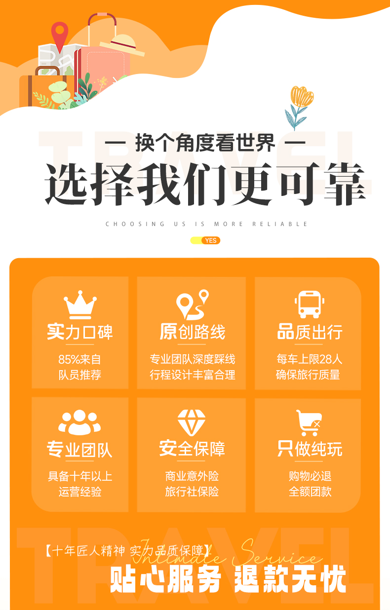 蜗牛旅行部落所有线路均为纯玩团,不进购物店,不强制消费,无隐形消费,所有费用公开透明,请您放心报名!