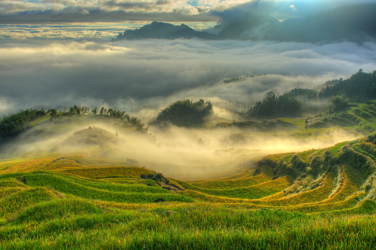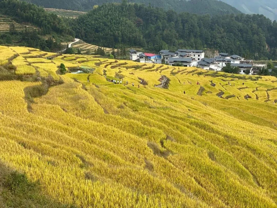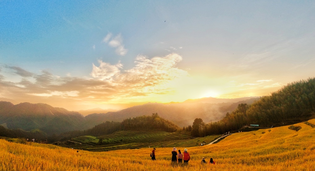 层层金黄的稻穗,仿佛镶嵌在大雾山脚的一片黄金