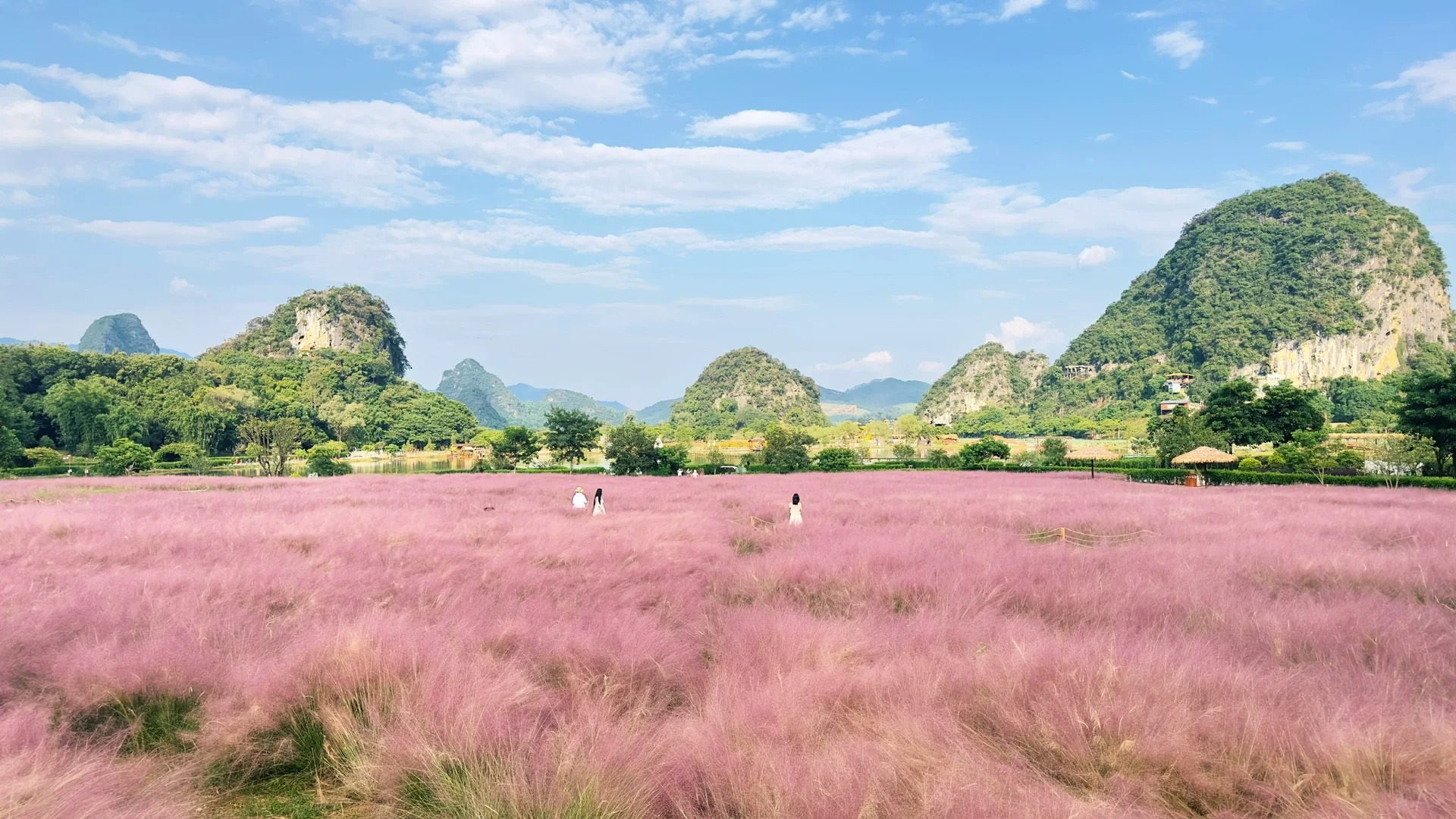 13:00 到达【峰林晓镇】一头扎进粉红色的海洋,合拍网红粉黛乱子草!在峰林的清风吹拂下,粉红花穗,轻微摇摆,如烟似霞,如云似雾,仿佛进入了仙境。午餐可以在景区的农庄约伴AA