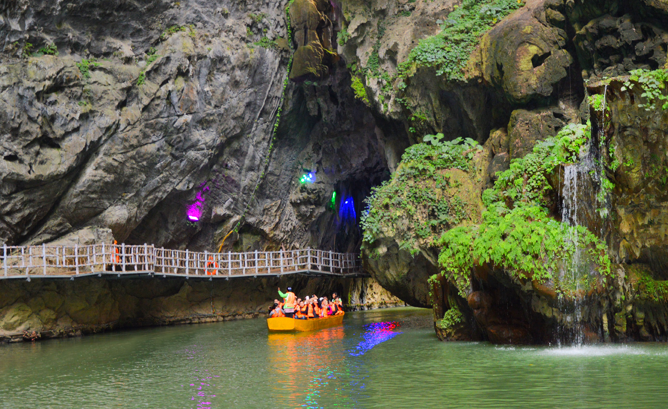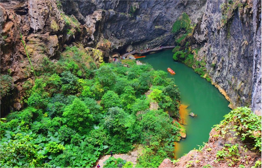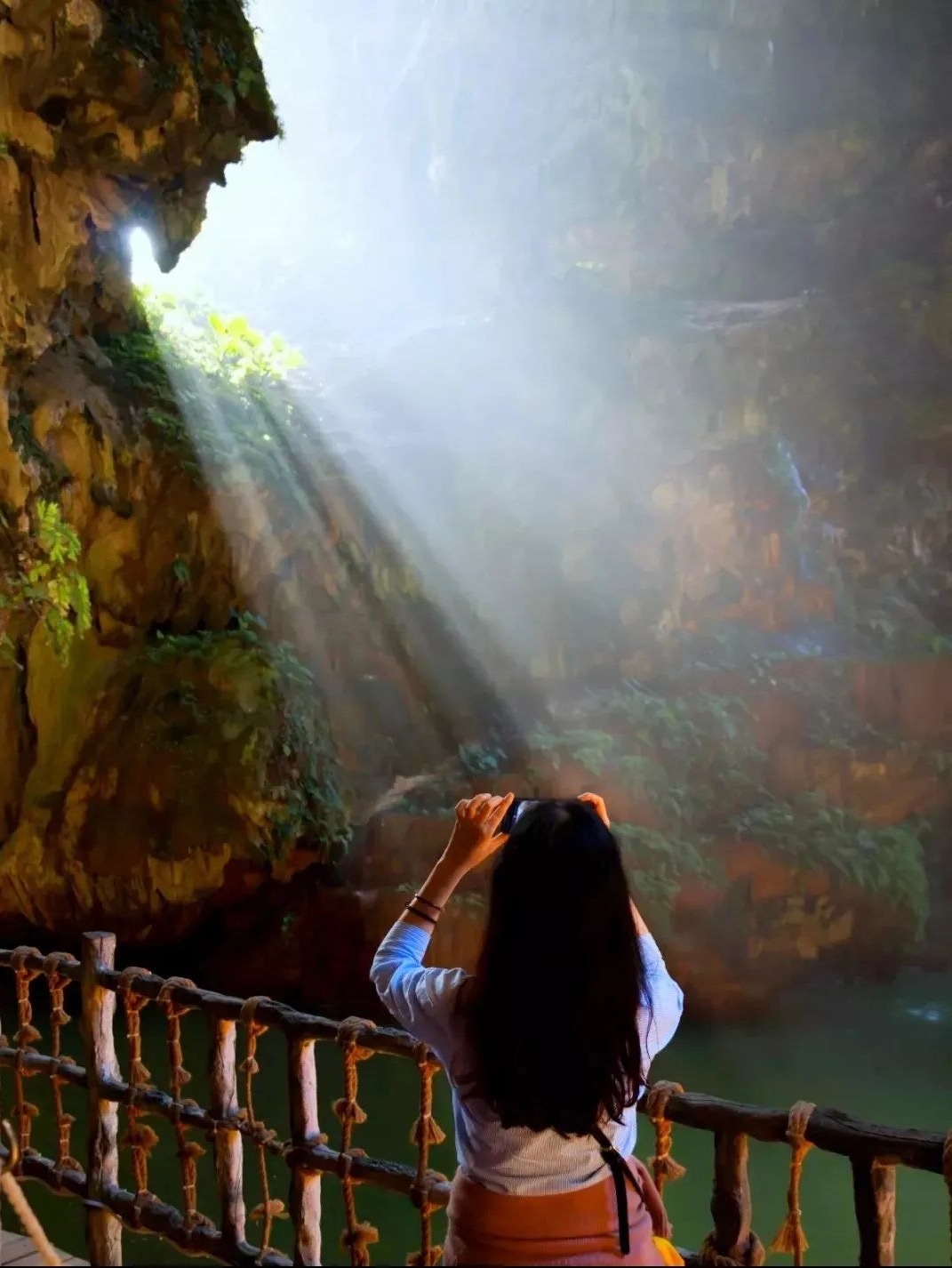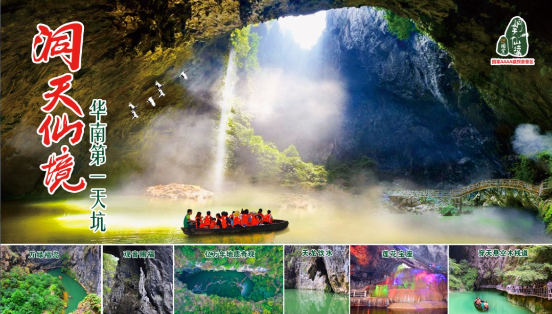 10:30 到达【洞天仙境】地处闻名遐迩的英西峰林走廊,素有“华南第一天坑”之称,走栈道进去,搭游船出来,感受亿万年历史行程的人间仙境