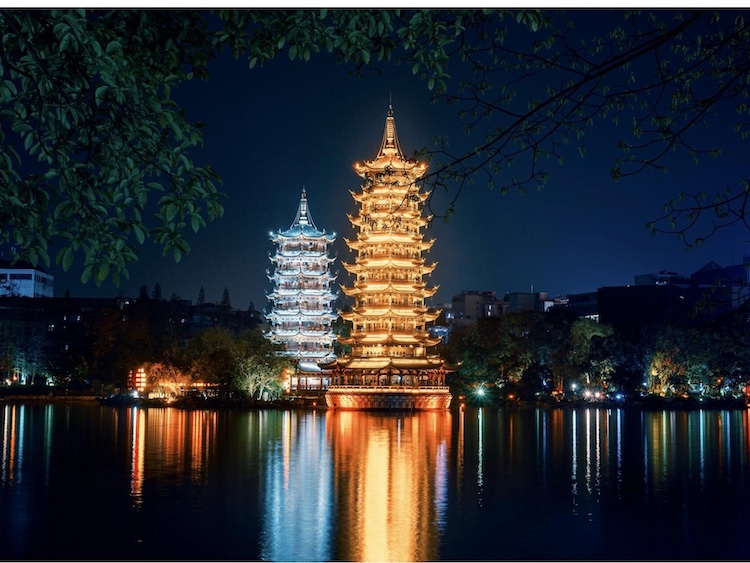 号称世界第一铜塔,地处桂林市中心区,是桂林旅游的一个绝美夜景观赏地。也是两江四湖环城水系中最著名的旅游景点。两塔之间以湖底一条10多米长的湖底隧道相连。