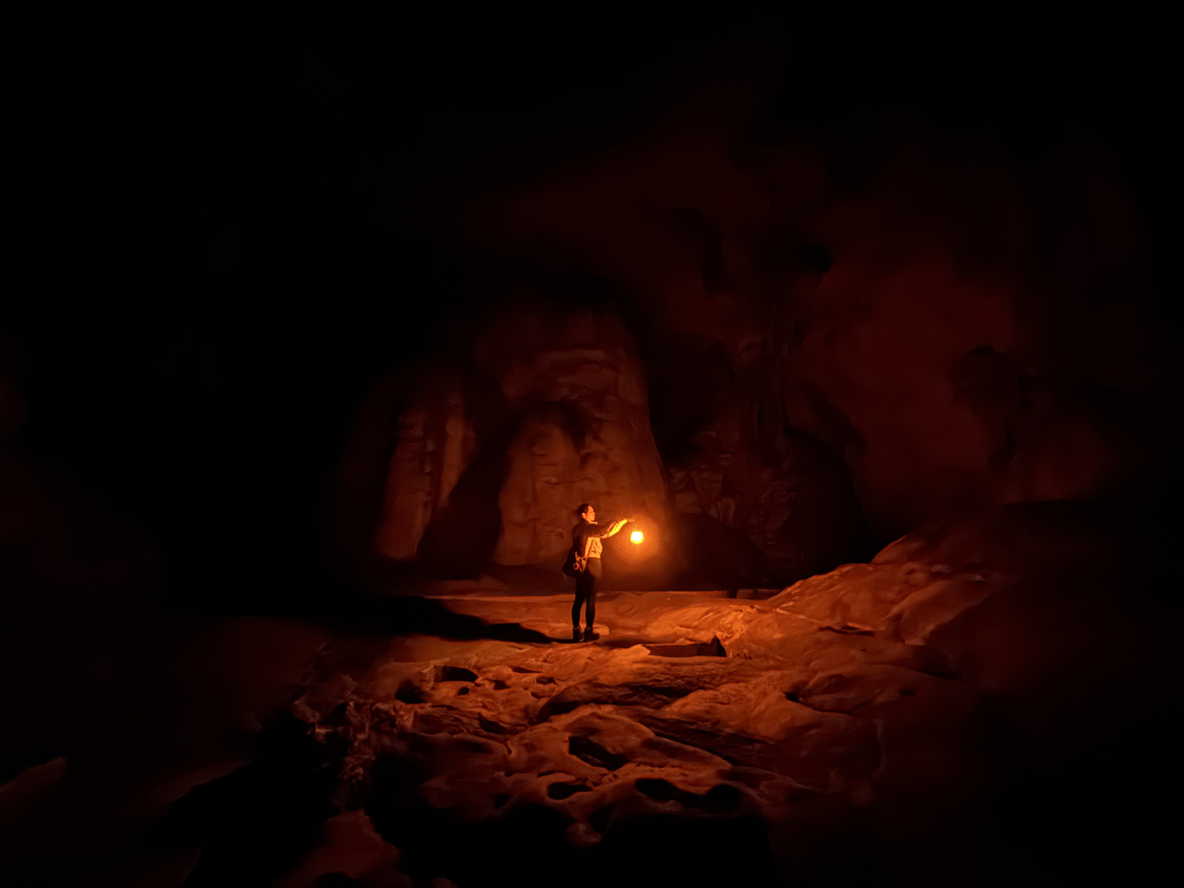 各种流石坝,美不胜收。溶洞里到处都石英砂晶石,用头灯一照,星光点点,如满天繁星