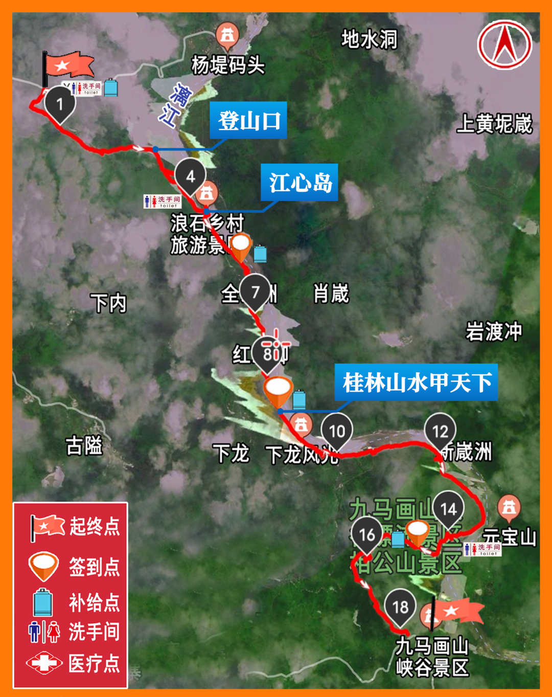 完整的漓江徒步线,是从大圩古镇出发,途径草坪,然后经过半边渡,到达杨堤码头,经过冷水渡,最终到达兴坪古镇。全程54公里。途中需要渡江好几次。