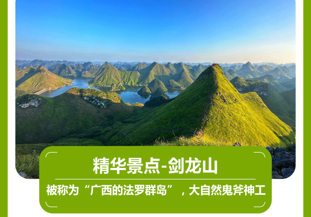 近期风景爆火的剑龙山被网友称为“广西的法罗群岛”这样的山水也只有在广西能看到,奇特的峰林连绵不绝,清澈干净的溪流,空气清新舒服,是徒步的好去处。
