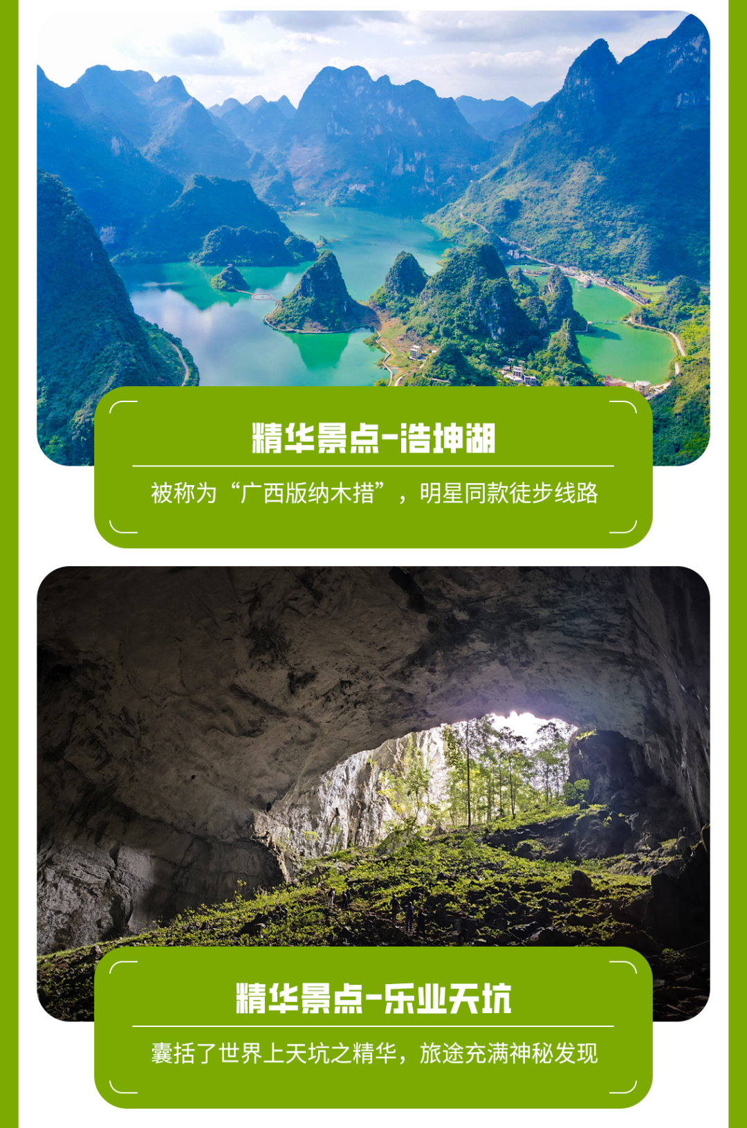 08:00早餐后出发,坐车1小时到达浩坤湖徒步起点,今天徒步网红浩坤湖穿越线,全程约13公里,爬升500米,徒步6小时左右。中午也是路餐干粮。这里也是广西山水经典的徒步景色