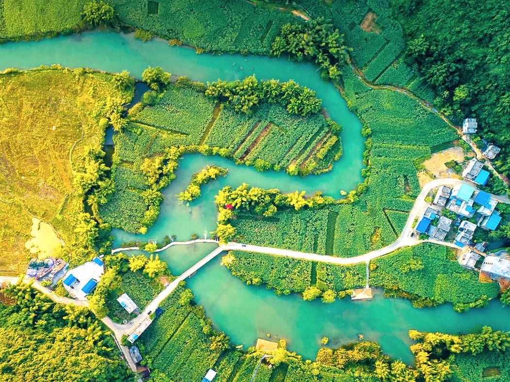 这里翠竹绕岸,农舍点缀,独木桥横,稻穗摇曳,农夫荷锄,牧童戏水,风光俊朗清逸,极富南国田园气息。