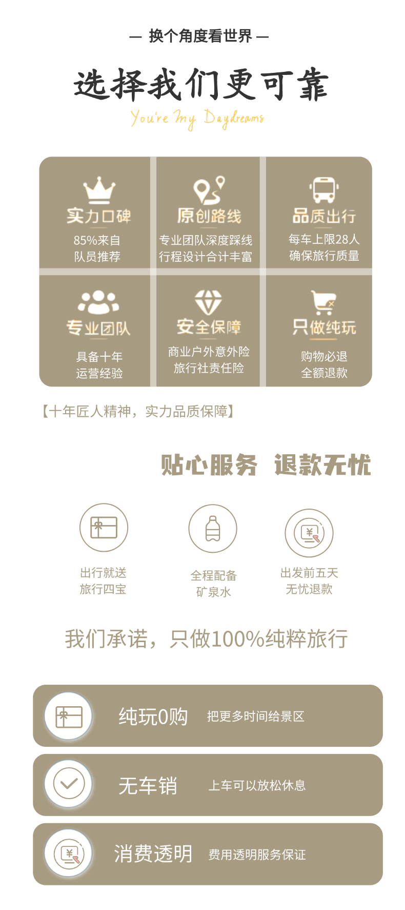 蜗牛旅行部落所有线路均为纯玩团,不进购物店,不强制消费,无隐形消费,所有费用公开透明,请您放心报名!