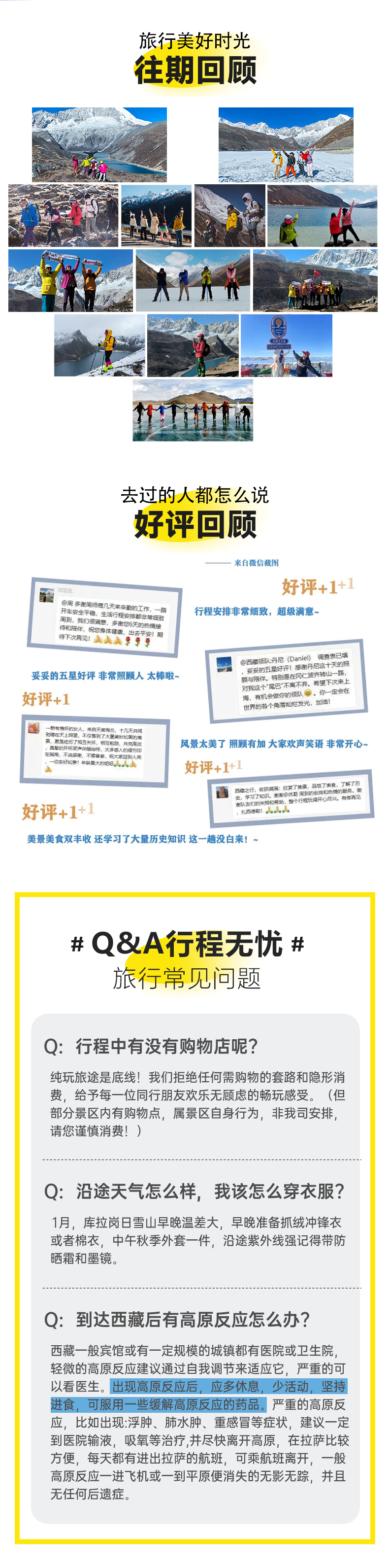 1.全程徒步约18公里,徒步平均海拔为4700米左右,徒步最高海拔为折公措垭口5000米左右,坐车最高海拔为蒙达拉山口5363米,住宿最高海拔为洛扎4000米左右。2.一月属于冬季,天气稳定,偶尔下雪,是看日照金山和星空最佳的时候,同时沿途的湖泊会结冰,也是看蓝冰的时候。