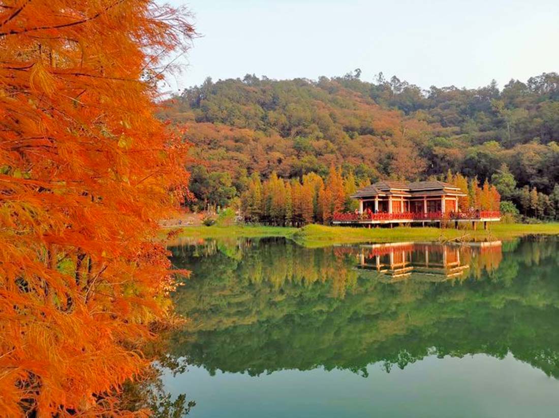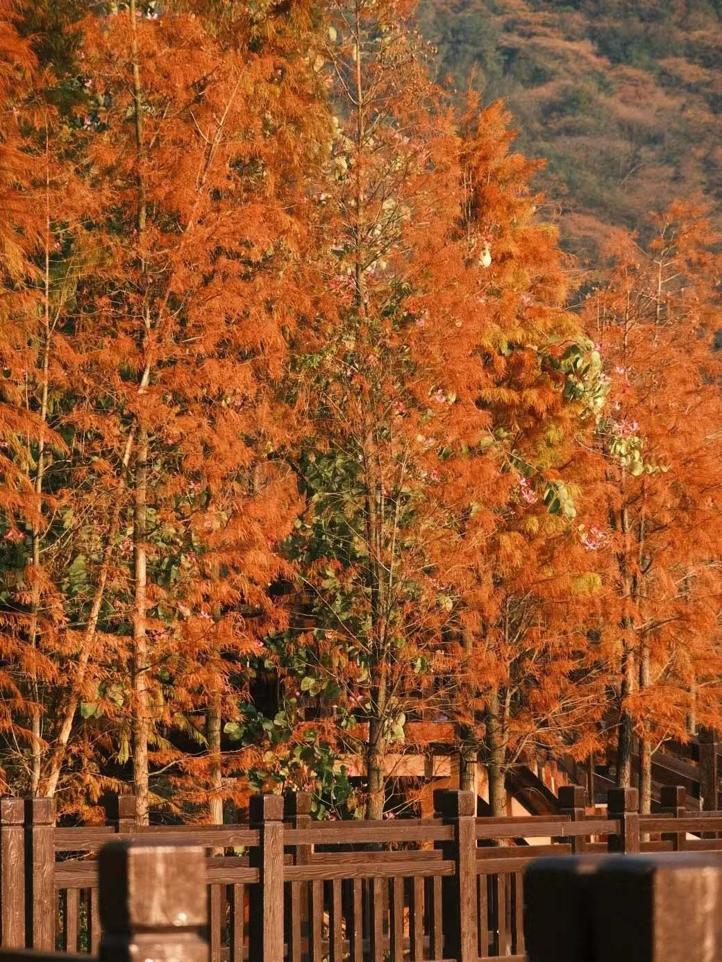赏新会“小九寨”的多彩冬日,落羽杉亦金亦红,交相辉映,让人流连忘返