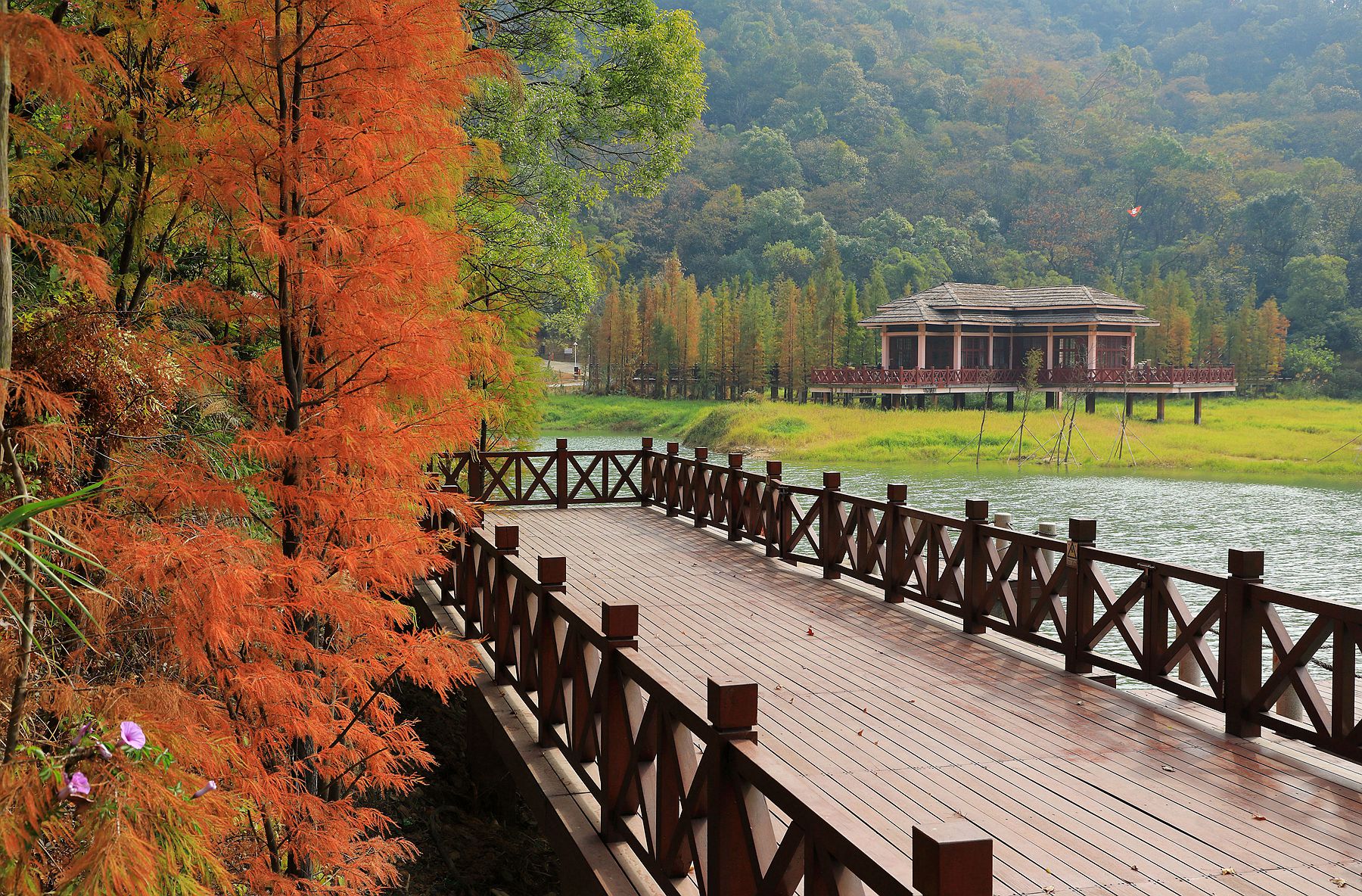 新会石涧公园的落羽杉披上了红装