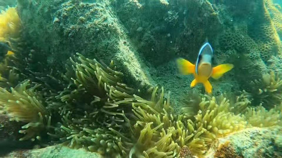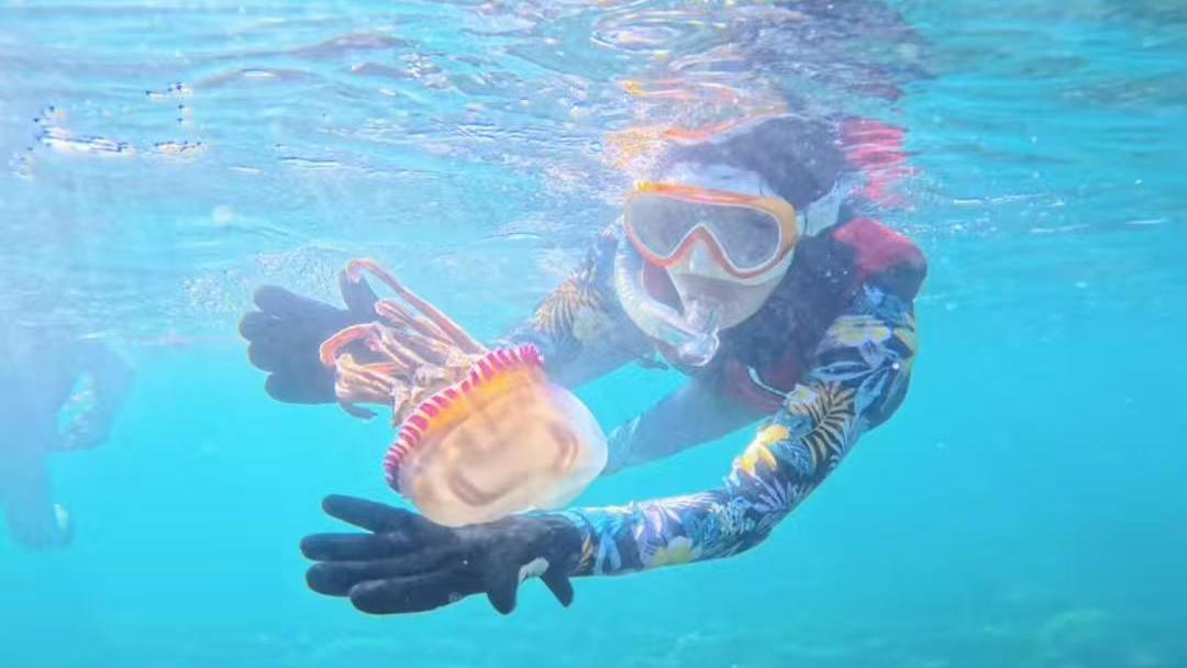 就能看到一个全新的世界:五彩斑斓的小鱼在身边穿梭,海胆、海螺静静地依附在礁石上