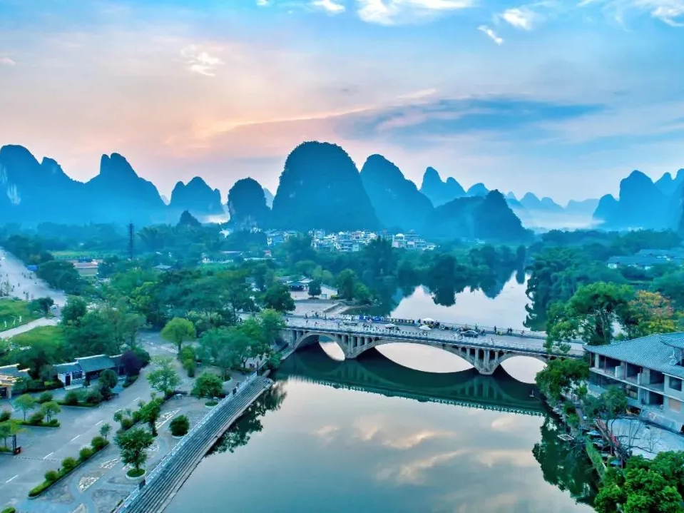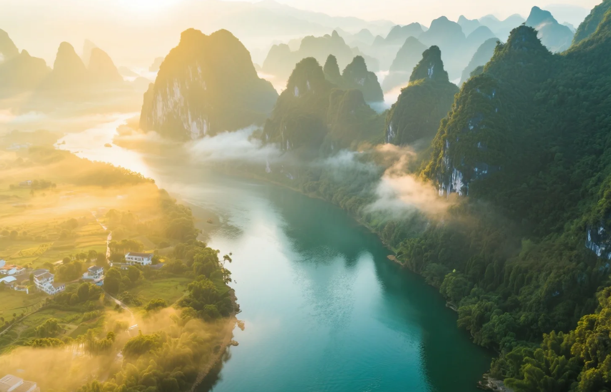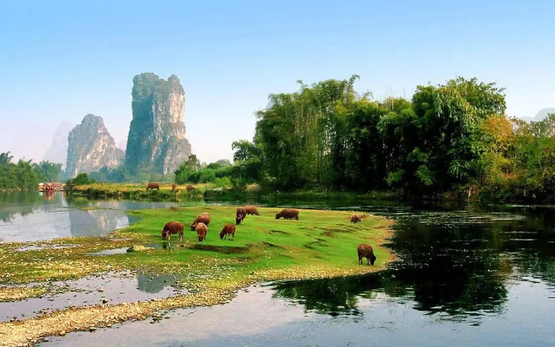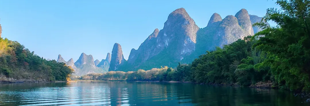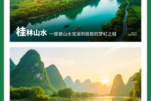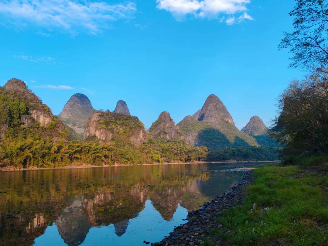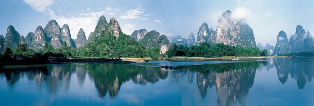 桂林四季皆美,漓江水清澈如镜,倒影清晰如画。晨间常有薄雾升起,漫过山腰,晕染出一片朦胧,就像一幅在天地间挥毫出的水墨丹青。
