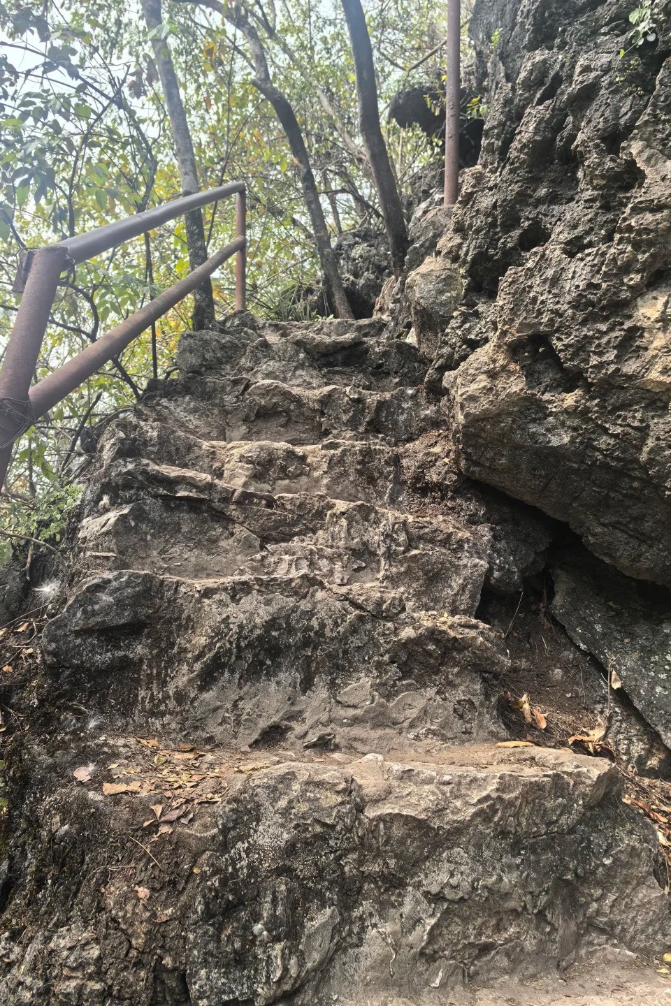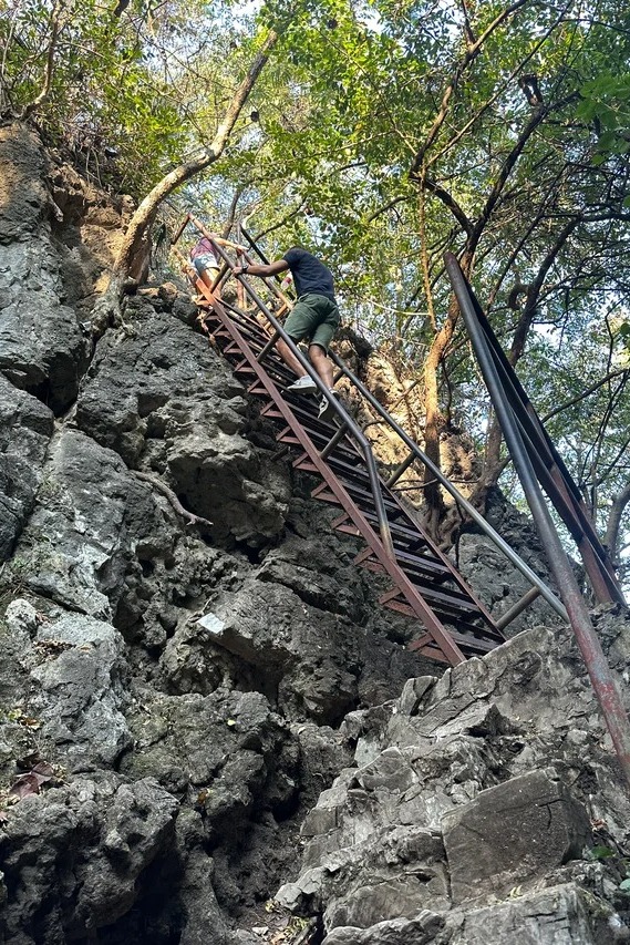 这里登山道都是由石头堆砌,狭窄且滑,基本没有护栏,快到山顶时有一个九十度的峭壁,搭建了一个接近九十度的钢梯。