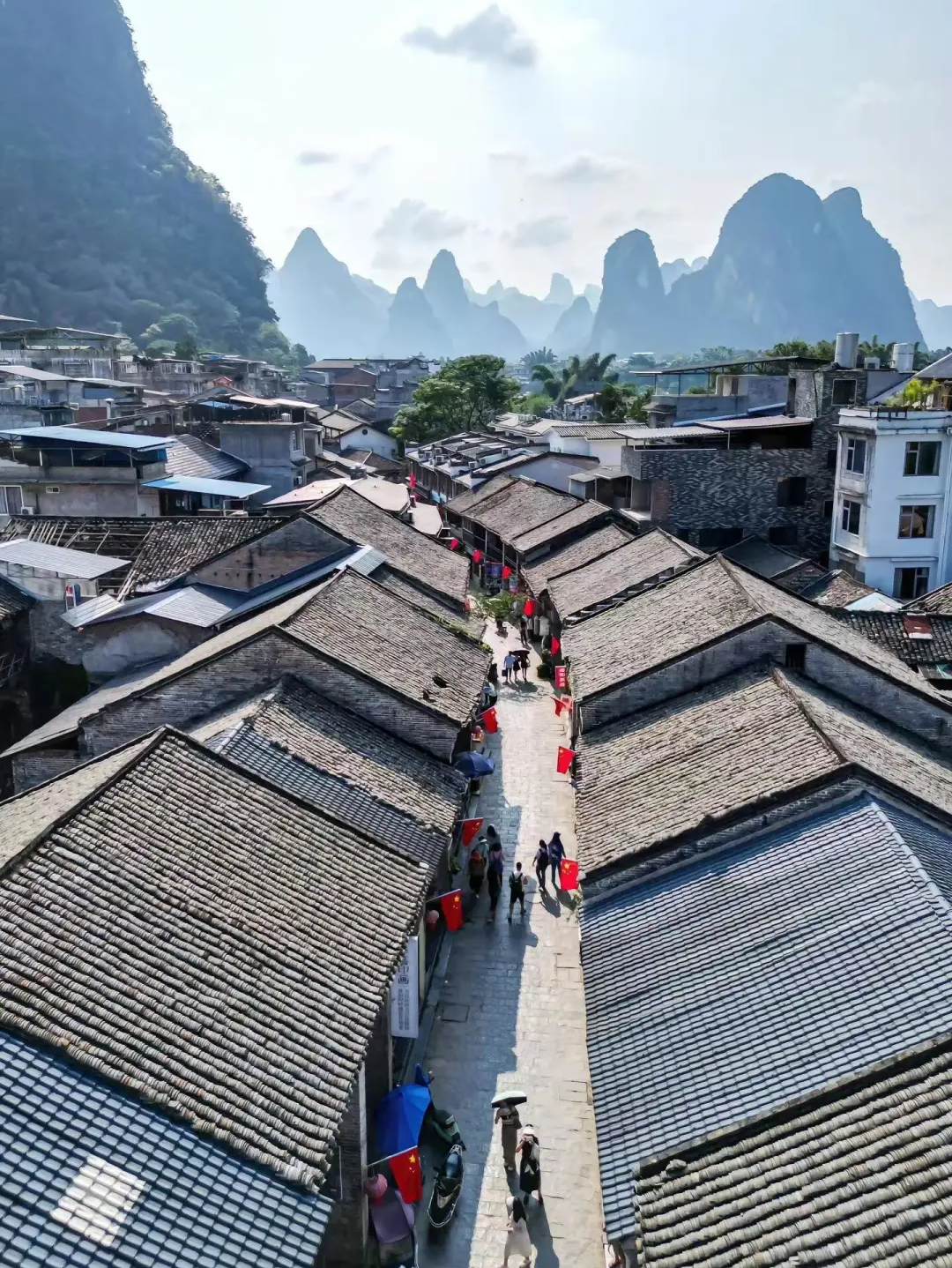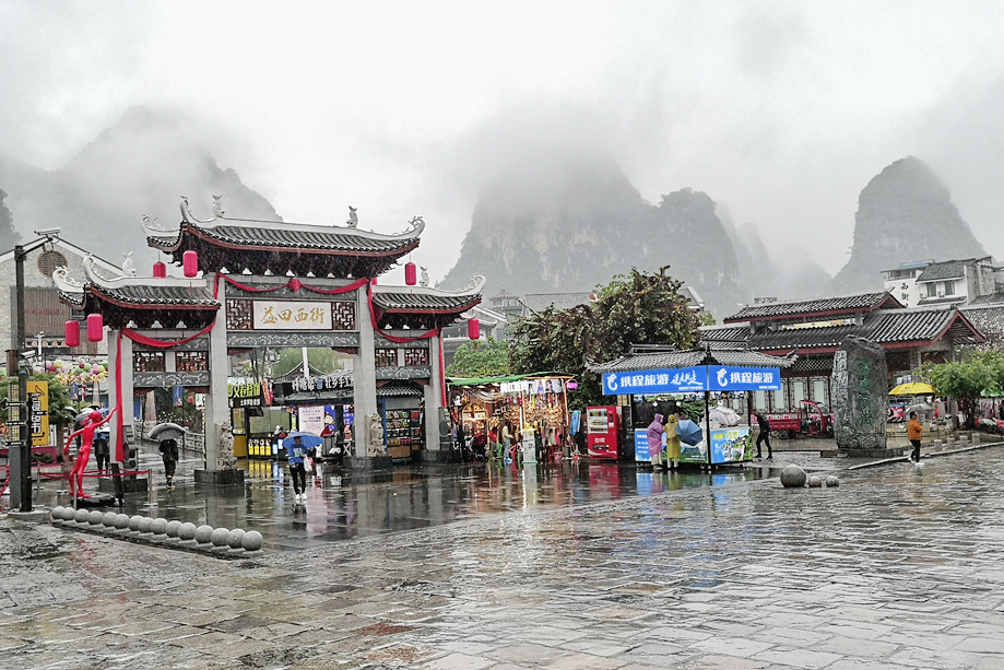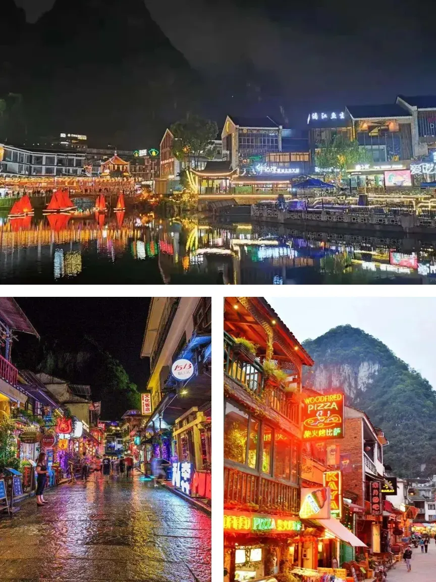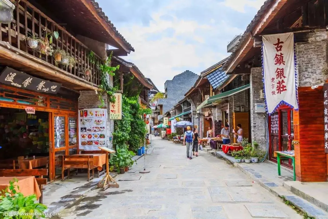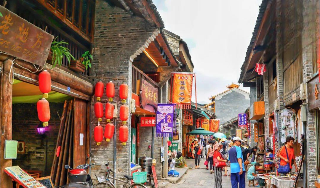 阳朔西街始建于明朝,拥有1400年历史,全长不到1公里,由石板砌成,呈弯曲的S形,留存着桂北民居特色,自开放以来,每年引数十万外国游客前往,甚至定居、开店,也就构成了西街中西文化交融的景象,被称为“洋人街”“地球村”