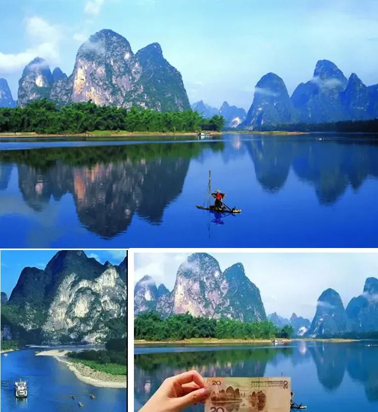 打卡漓江20元人民币背景图,兴坪素以山水秀丽、景甲天下而著称,雨天烟雨如梦,行舟在碧波上,仿佛人在画中游