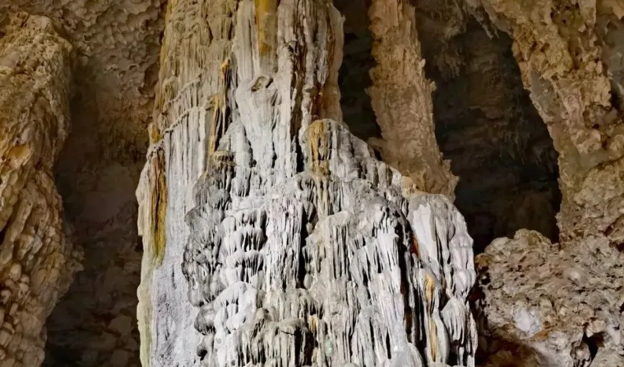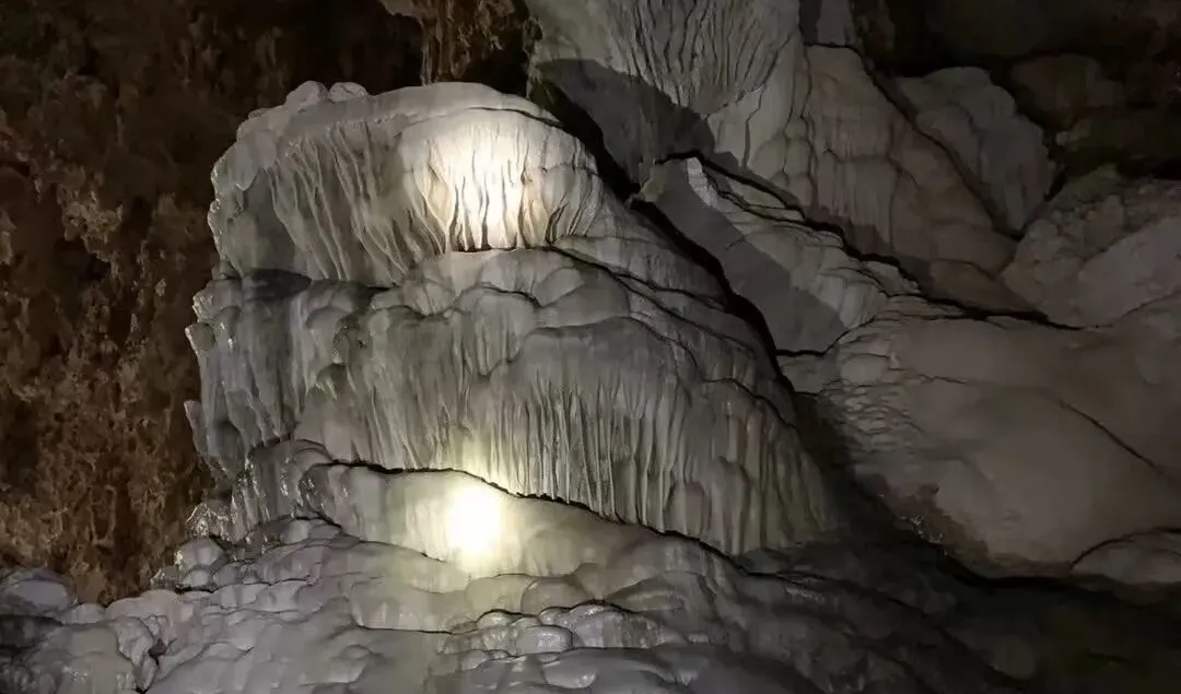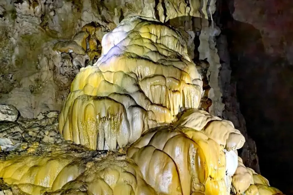 这里没有辣眼睛的彩灯,只有头灯照亮最原始的地质奇迹。巨大的石笋、悬垂的石幔、绽放的石花,构成了一座沉寂而华丽的“地下宫殿”