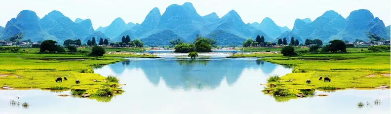 遇龙河徒步是国内较为经典的徒步路线,素有“小漓江”之称,是阳朔山水的精华。遇龙河全长43.5公里,是漓江在阳朔境内最长的一条支流。沿河的山水田园风光十分秀美,水面清澈如镜,随手拍出的照片就是一幅天然的山水画