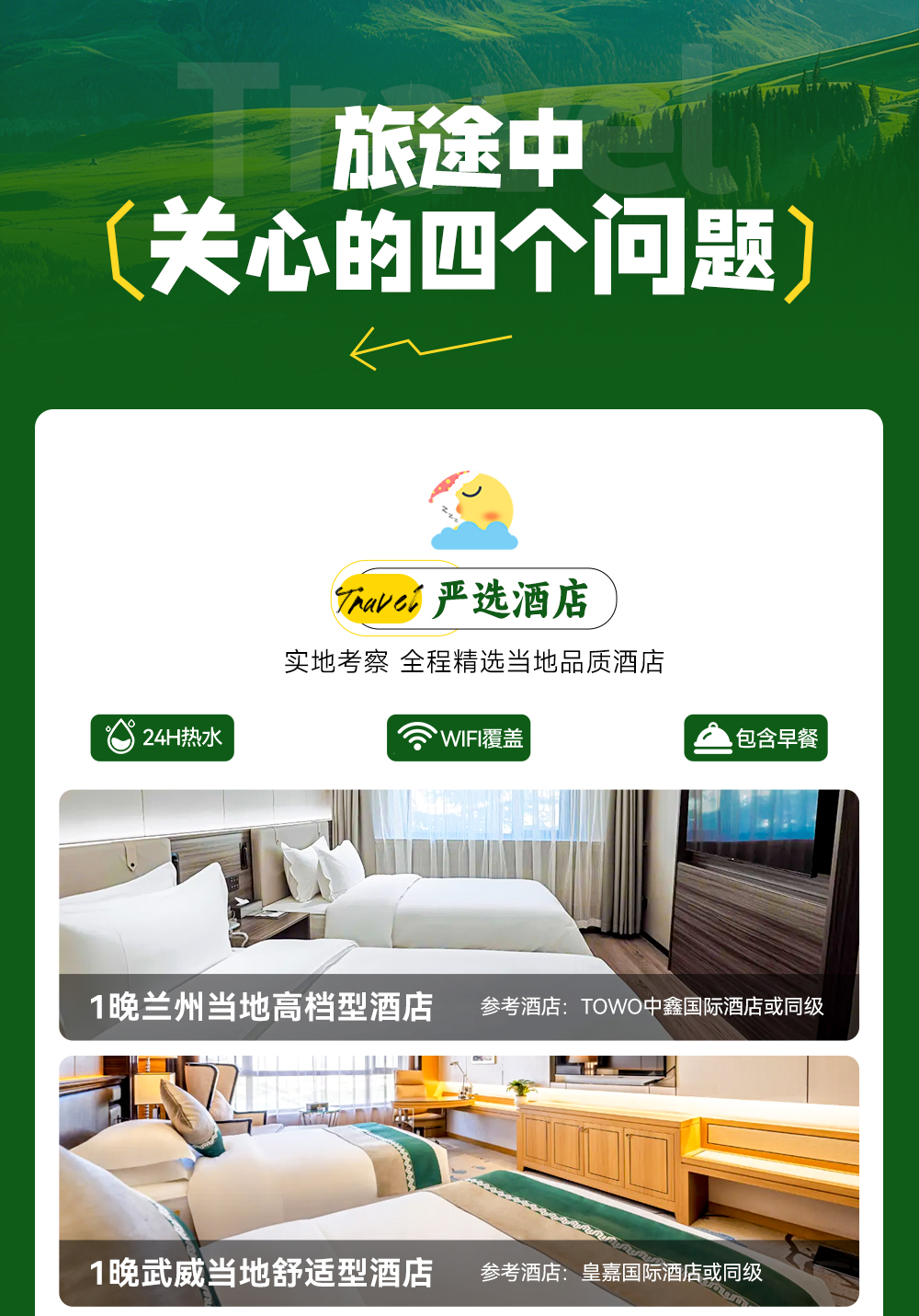 1、交通:兰州出发及返回兰州解散的全程专属用车及司机星级服务(含司机餐补、住宿)