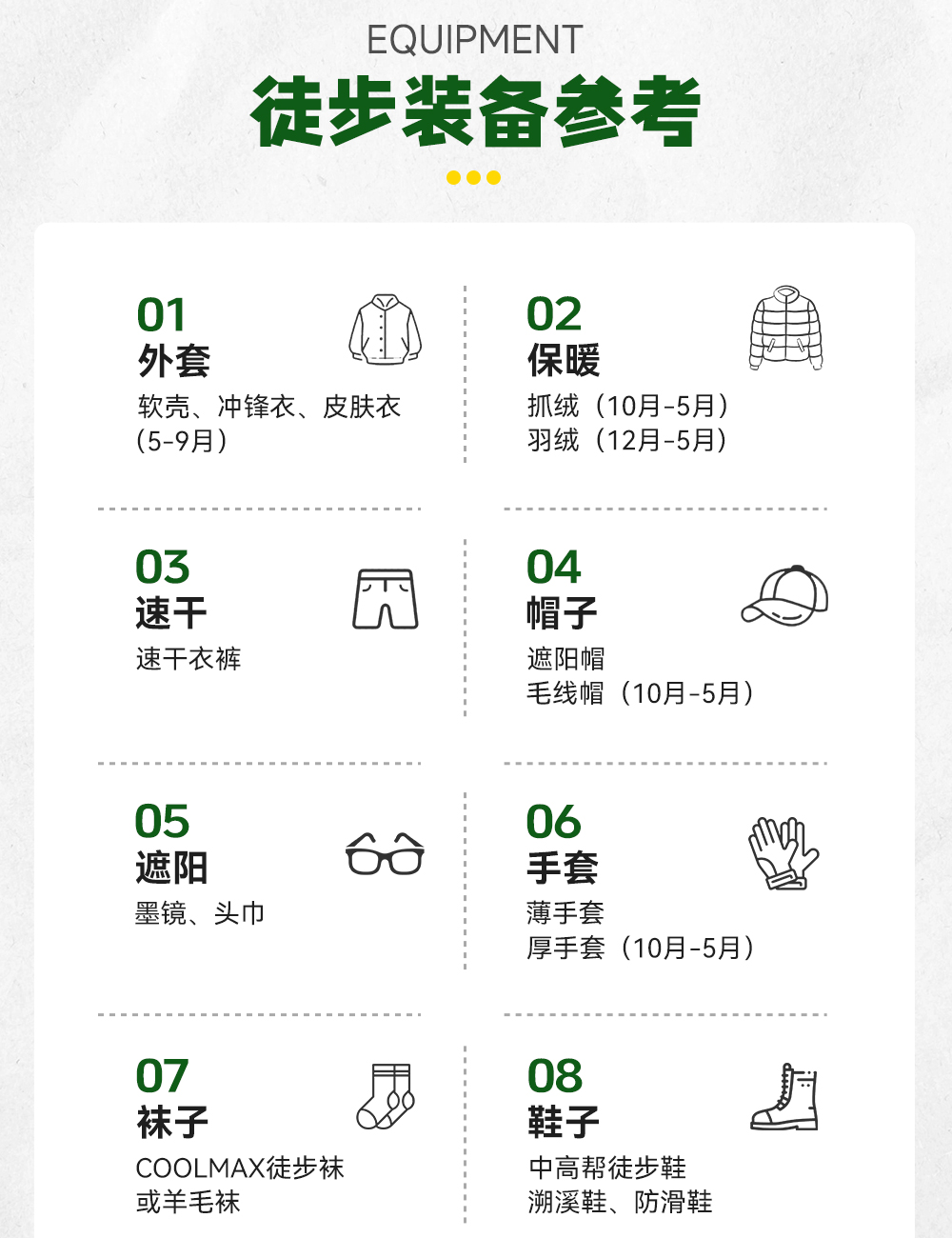 4、今日徒步时间较长,景区内的补给站物品资源相对较少,建议大家提前备好吃食。